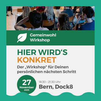 | Gemeinwohl Wirkshop: Hier wird's konkret Art der Veranstaltung: Nachhaltigkeit Ort: | NachhaltigkeitWorkshop | DOCK8Kath. Kirche Bern | |