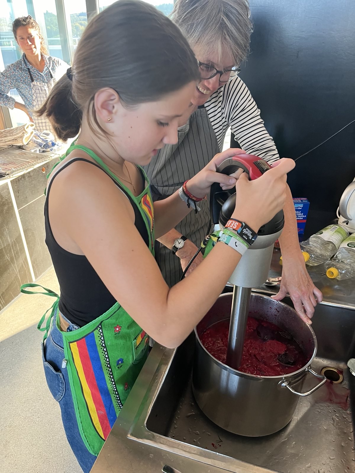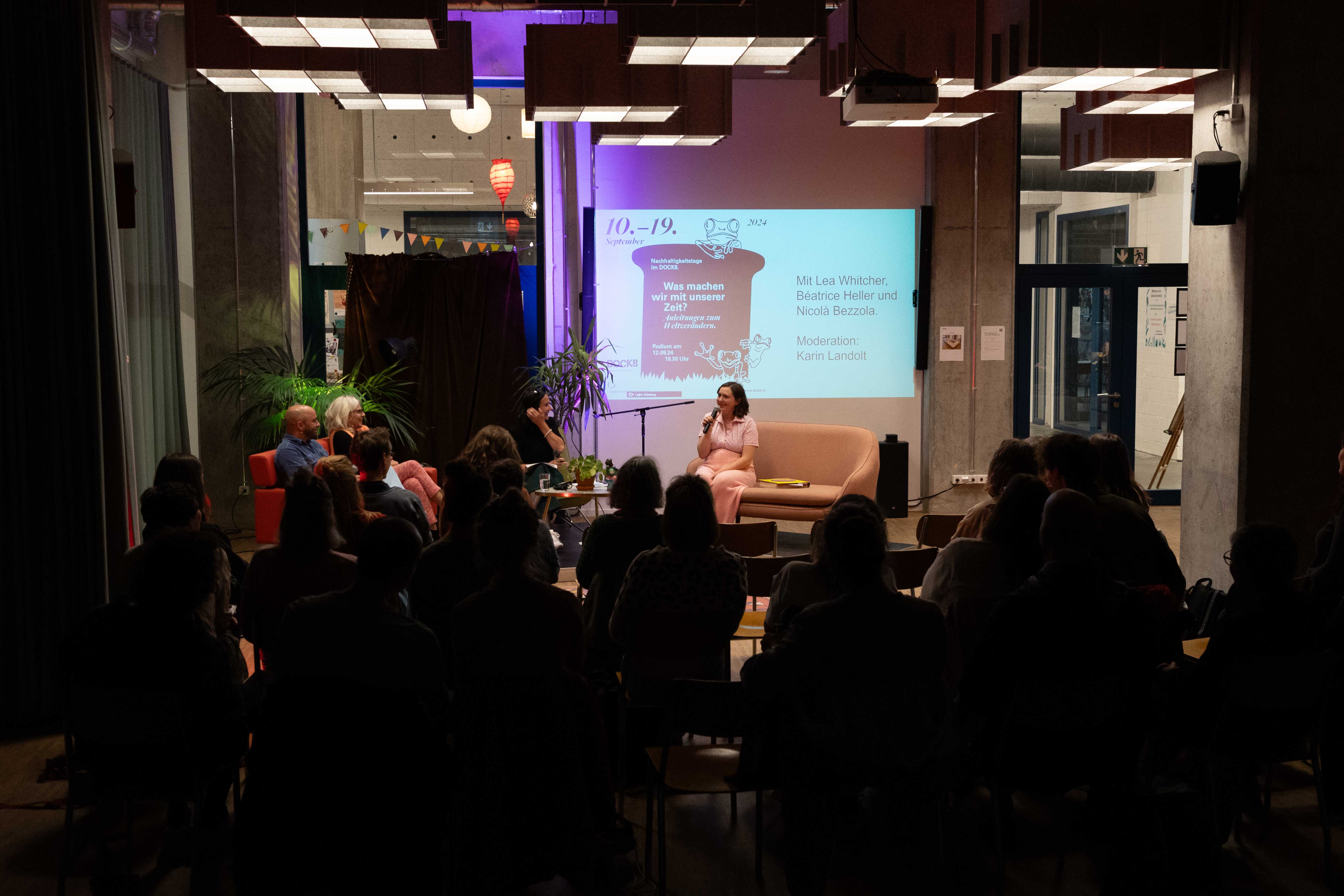 Spielerisch, visionär, lachend, aber auch ernst stellten wir uns mit den diesjährigen Nachhaltigkeitstagen der Frage «Was machen wir mit unserer Zeit?». So bauten und gestalteten Kinder am nachhaltigen Mittwoch ihre Vision der Welt im Jahr 2044. Am Podium «Was machen wir mit unserer Zeit? Anleitungen zum Weltverändern» tauschten sich Achtsamkeitsprofi Bèatrice Heller, Kunstschaffende Lea Whitcher und Nachhaltigkeitsforscher Nicolà Bezzola zu Zeitwohlstand, Arbeitszeitreduktion, Care-Cities sowie Achtsamkeitspraktiken aus und gaben dem Publikum nicht nur Tipps für den Alltag, sondern auch kritische Fragen mit auf den Weg. Der Kochkurs «vegan unter 5 Fr.» lehrte die Teilnehmenden ressourcenschonende Kulinarik und im Parkour-Workshop von ParkourONE erfuhr das Publikum, dass es für eine nachhaltige Freizeitgestaltung nicht mehr als den eigenen Körper, gewisse Techniken und Neugierde braucht. Zerowaste führte die Workshop-Teilnehmenden in 10 Schritten zu nachhaltigen Alltagsgewohnheiten, einen Tag darauf lernten die Anwesenden die Vision der Gemeinwohl-Ökonomie kennen. In der Schnippeldisco produzierten Jung&Alt leckere Pasten und Hummus fürs Foodsave-Bankett und beim PIXMIX Vol. 87 beantworteten Referent:innen in einem Mix auf Pix und Performance die Frage «Hesch Zyt?»